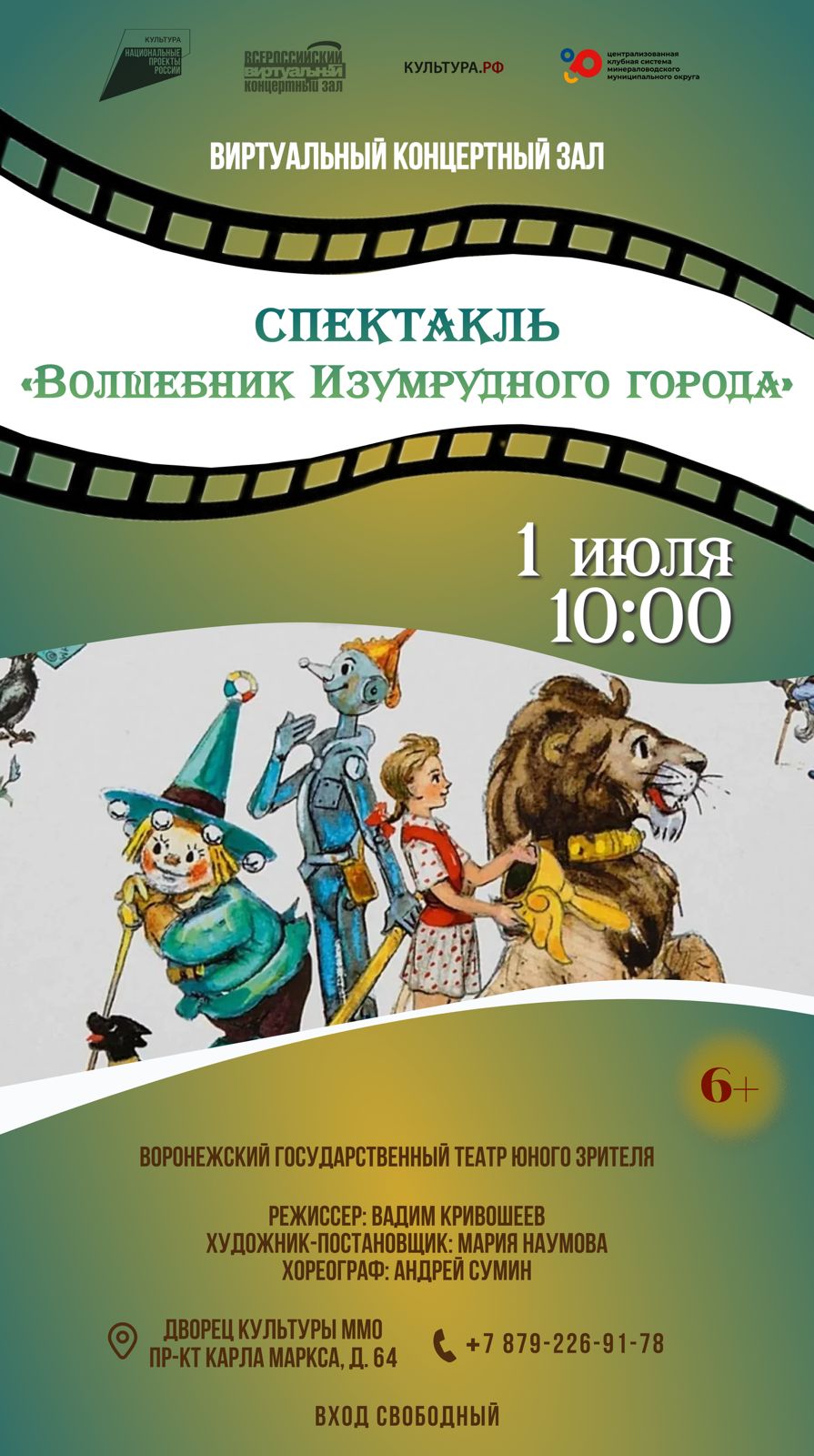 В рамках Всероссийского проекта «Виртуальный концертный зал» 1 июля на большом экране Дворца культуры Минераловодского муниципального округа состоится показ спектакля Воронежского государственного театра юного зрителя «Волшебник Изумрудного города».