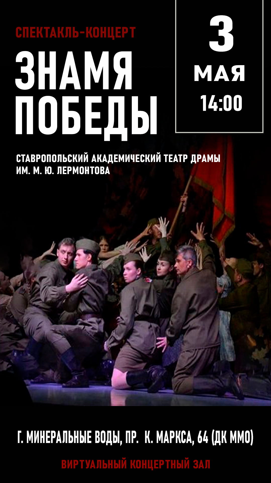 3 мая во Дворце культуры Минераловодского муниципального округа состоится трансляция спектакля-концерта Ставропольского академического театра драмы имени М. Ю. Лермонтова «Знамя Победы». Показ пройдёт в рамках проекта «Виртуальный концертный зал».