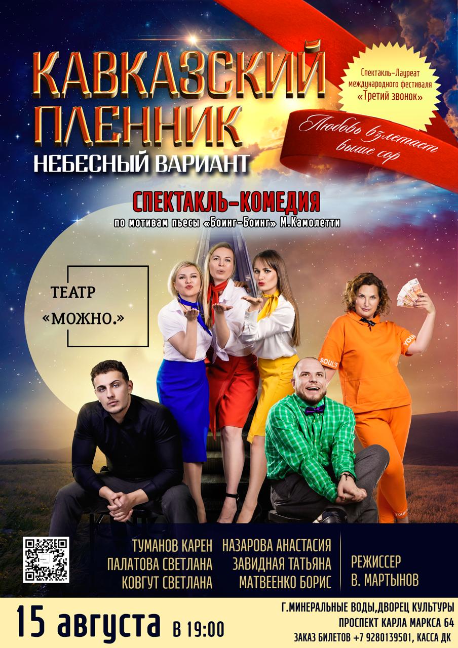 15 августа студия «МОЖНО.» покажет во Дворце культуры Минераловодского муниципального округа комедию «Кавказский пленник. Небесный вариант». Это история трёх невест, которые борются за внимание единственного мужчины.