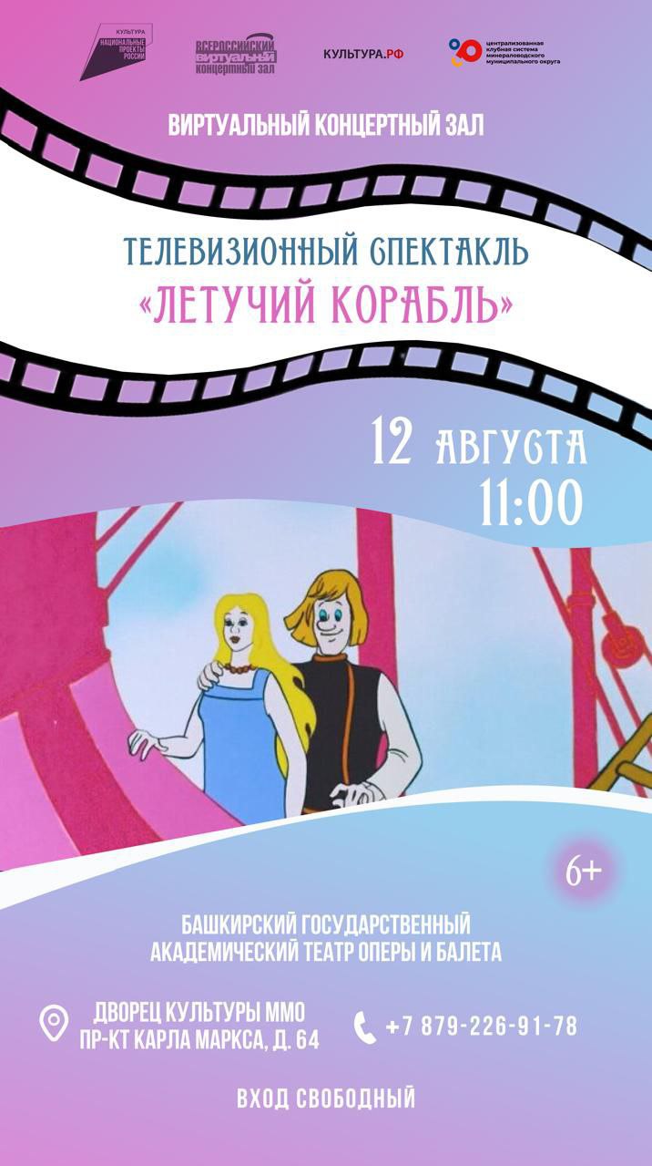 В рамках Всероссийского проекта «Виртуальный концертный зал» 12 августа во Дворце культуры Минераловодского муниципального округа покажут телевизионный спектакль «Летучий корабль», подготовленный артистами Башкирского государственного академического театра оперы и балета.