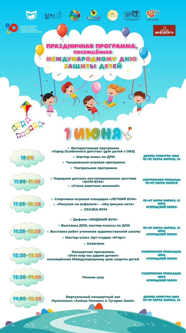 В 12:30 на сценическом комплексе парка выступят творческие коллективы в рамках праздничного концерта «Этот мир мы дарим детям!», после чего всех участников ждёт пенное шоу и показ во Дворце культуры ММО мультфильма «Алёша Попович и Тугарин Змей».