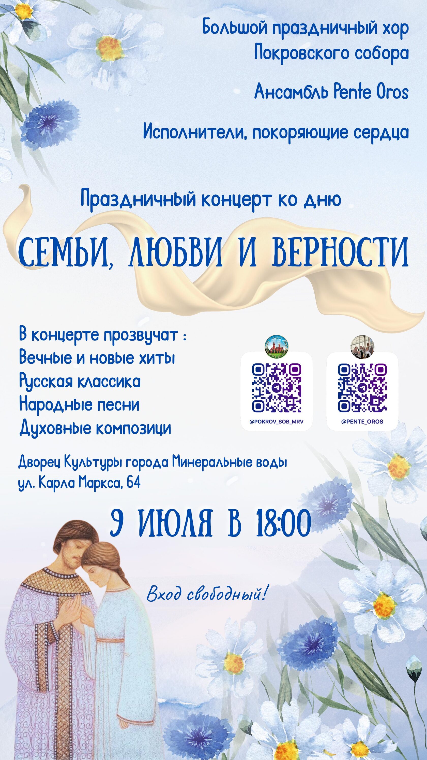 9 июля во Дворце культуры Минераловодского муниципального округа состоится большой праздничный концерт, посвящённый Дню семьи, любви и верности. На сцену выйдут хор Покровского собора и ансамбль Pente Oros, которые исполнят как вечные, так и новые хиты, а также композиции русской и духовной классики, народные песни.